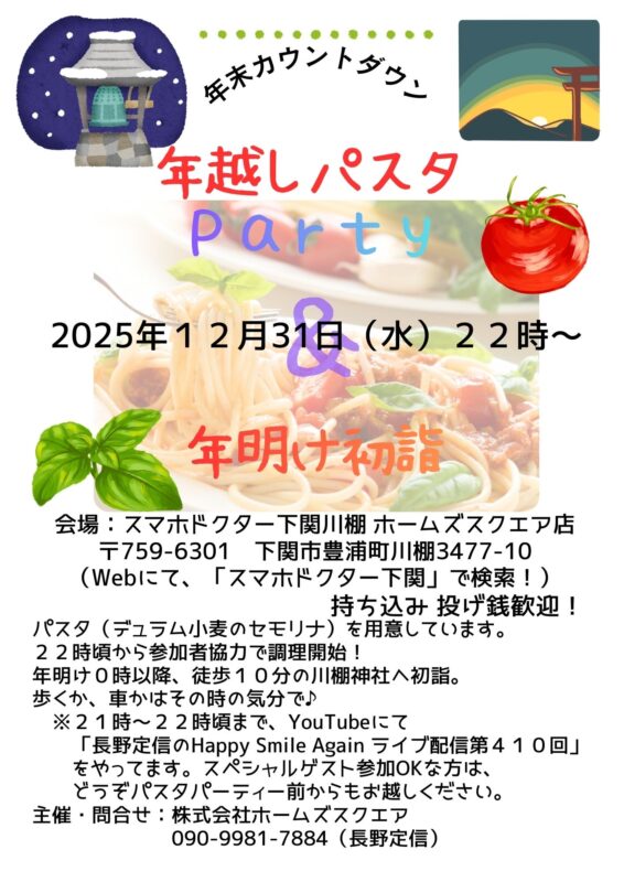2025年12月28日 12月31日22時~年越しパスタパーティー&年明け初詣