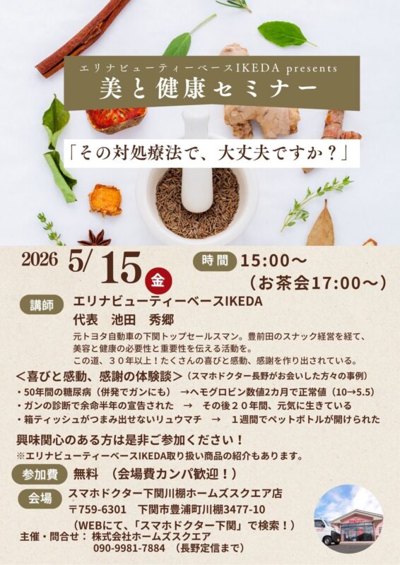 2026年04月28日 5月15日(金) 美と健康セミナー「〜その対処療法で、大丈夫ですか?〜」